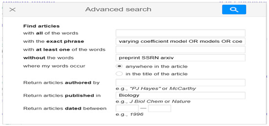 Figure 5. Advanced search box for publications with the phrase “varying coefficient model OR models OR coefficients” in biology. As explained above, a search across all years with a domain’s name (e.g., Biology) was initiated if a publication from the sample of 656 in 2022 had this domain’s name in its title.- ○