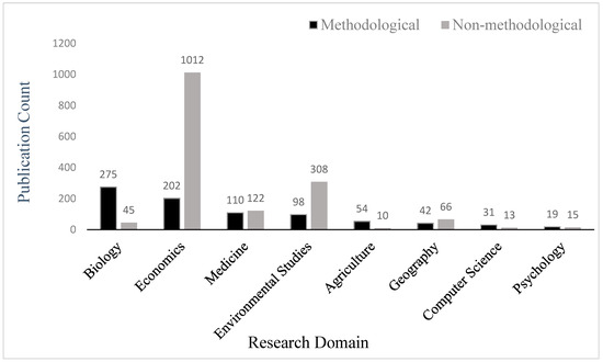 Figure 7 below summarizes the number of publications that were retrieved in different research domains classified into methodological and non-methodological publications. This classification was designed to compare research domains on their relative acceptance of the VCM. The results in the figure imply that economics, environmental studies, and geography, in this order, were the highest in accepting the VCM as a tool for studying statistical interactions.