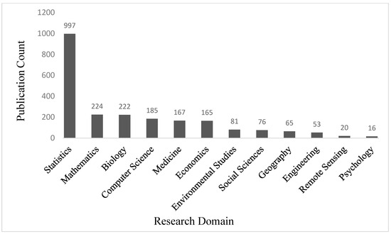 Number of publications with the VCM in research domains for which the search did not lead to a methodological/non-methodological classification. In the list below “Domain” = retrieved by domain’s name, “Title” = retrieved by journal title. (x) = number of retrieved papers. The publication count in Figure 6 does not include all publications in Statistics and Mathematics from the list below, as domain-specific ones were counted in Figure 7 (e.g., Statistics in Medicine which appears in the notes below Figure 7). “Information”, “Remote sensing”, “Machine learning”, and “Artificial intelligence” were merged into “Information and data science” in Figure 6.