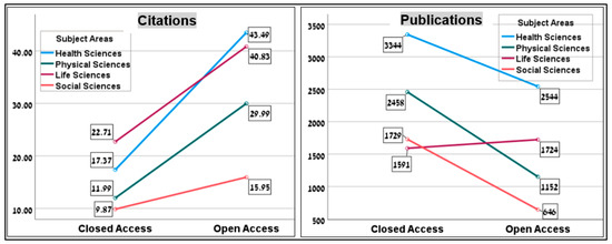 Descriptive statistics of publication and citation in each mode (open and closed access) between 2010 and 2020 by countries and subject area.