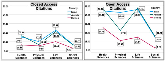 RQ1. How do the “OA citation and publication advantages” vary across subject areas (health, physical, life, and social sciences) and countries (Austria, Israel, and Mexico)?