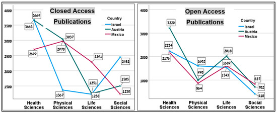 Publishing mode (closed vs. open access) by subject area (health, physical, life, and social sciences) and country (Austria, Israel, and Mexico): main effects and interaction effects.