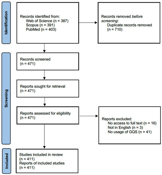 - Scopus was queried with the following search string: TITLE-ABS-KEY = (“global quality scale*” OR “global quality score*”). Document type and language filters were similarly applied. This search yielded 391 publications.