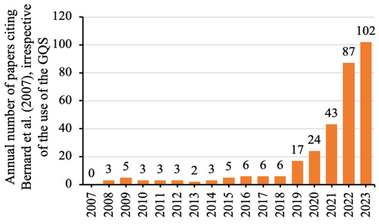 Number of papers citing Bernard et al. (2007) via a cited reference search in the Web of Science Core Collection, irrespective of whether these citing papers used the GQS or not.
