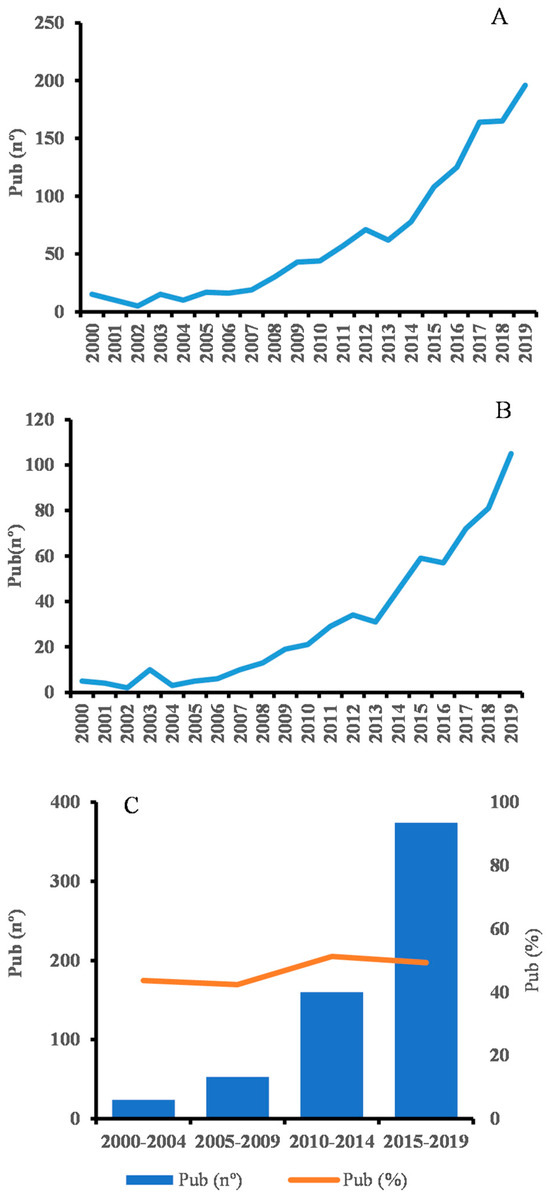 The number of articles on NCs increased from 15 in 2000 to 196 in 2019 (Figure 2A), as did the number of articles mentioning funding (Figure 2B). Of the total 611 articles mentioning funding, 5 articles were published in 2000 and 105 in 2019. The highest number of articles can be observed in 2015–2019 (Figure 2C). During this period, 374 articles with funding information were published. The relative weight of articles with funding increased between 2000–2004 and 2015–2019 (publication year), but the pattern is far from linear. There are two moments when the number of articles increased but their representativeness decreased (between 2000–2004 and 2005–2009, and 2010–2014 and 2015–2019). In 2015–2019, funding was recognized in about 50% of articles, compared to 44% in 2000–2004 (Figure 2C).