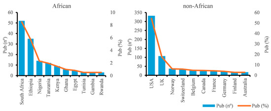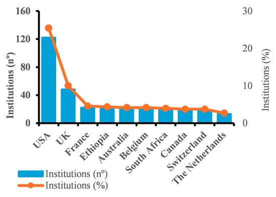 Research on NCs in Africa was funded by 479 institutions (SI, Table S4). The geographical distribution of institutions is highly skewed, with approximately 26% of institutions located in the USA and 10% in the UK (Figure 5). The presence of African countries in the top 10 in terms of number of institutions is low, with only Ethiopia and South Africa represented.