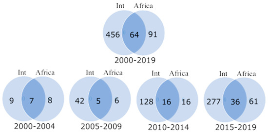 Co-funding activities are not frequent, as only a small proportion of research was funded by African and non-African countries simultaneously, namely 64 articles (10% of all articles with funding information) over the entire period (Figure 4). However, it appears that funders are recognizing the importance of working together to solve problems in Africa, as co-funding activities are generally increasing. Funding that comes exclusively from non-African institutions is the most widespread. They are mentioned in about 75% of all articles with funding information in 2000–2019, underlining the high dependence on foreign funding mentioned previously.