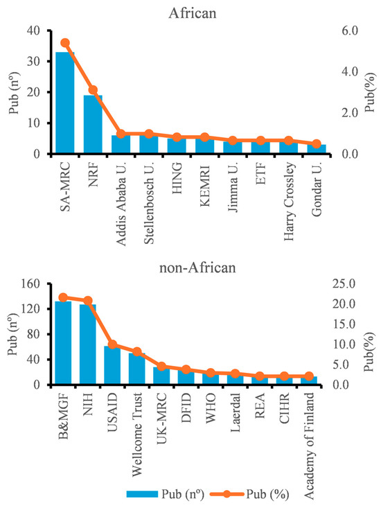 The top 10 institutions, according to the number of articles where they are mentioned as funding sources, by region (African and non-African) and representativeness in the total number of articles acknowledging funding.