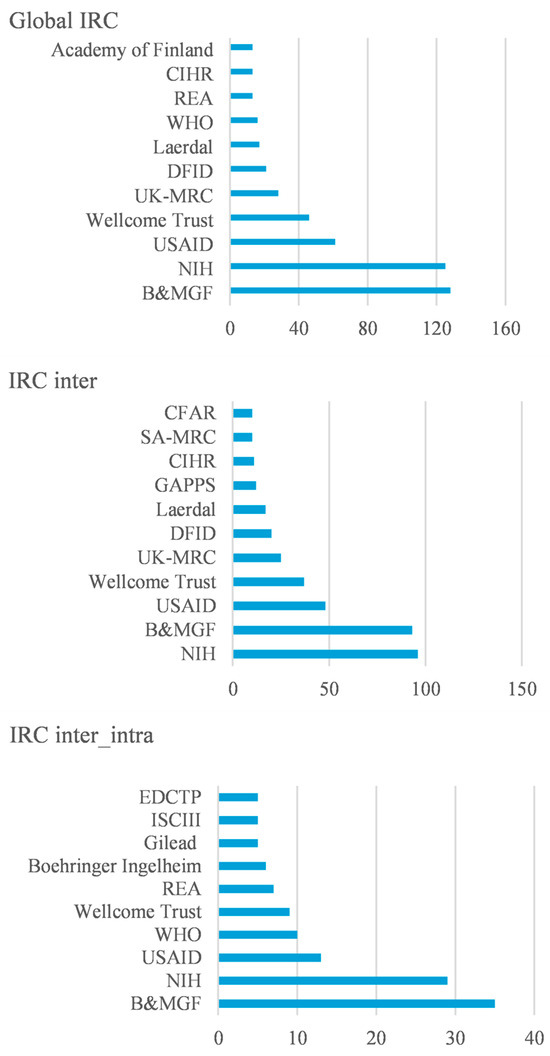 As for the collaboration between several African countries and one or more non-African countries (Figure 7, plot IRCintra_inter), the crucial role of B&MGF, NIH, and USAID as funders continues to emerge. However, other institutions of a different nature are unveiled, as pharmaceuticals Gilead Sciences, Inc (Gilead) and Boehringer Ingelheim, although with participation below that observed for B&MGF, NIH, and USAID. The Instituto de Salud Carlos III (ISCIII) and the European & Developing Countries Clinical Trials Partnership (EDCTP) are also in the top 10. These institutions and partnerships are mentioned in 75% of the articles with IRCintra_inter and information on funding.