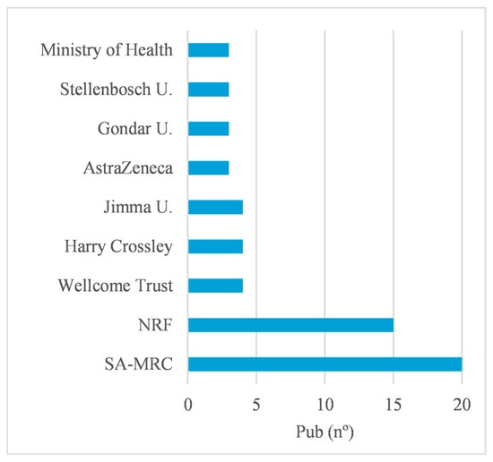 From a global perspective, the results suggest that the majority of funding comes from a few institutions, as the distribution of articles by source is very skewed (SI, Table S4), with few institutions being mentioned in many articles. The institutions in the top 10 appear in about 55% of the articles acknowledging funding, and 301 institutions (about 63% of all institutions) were mentioned in only one article (SI, Table S4). This top group is made up almost exclusively of non-African institutions. The Medical Research Council (SA-MRC) and the National Research Foundation (NRF) from South Africa are the only African institutions.