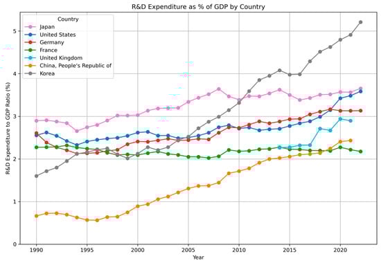 The Science, Technology, and Innovation Basic Plan is formulated with consideration of trends in the Japanese economy. It includes a target ratio of research funding to gross domestic product (GDP), as well as specific strategies and policies to stimulate scientific research development (Mitsubishi Research Institute Inc., 2016). However, Japan’s research and development (R&D) expenditure, as a percentage of GDP, has remained relatively flat over the past 15 years, particularly in comparison with other science-oriented G7 countries and neighboring economies (Figure 1). In the fifth Science and Technology Basic Plan that covered the 2016–2020 period, a target was set to achieve research and development (R&D) investment of at least 4% of GDP through both public and private sector contributions. This goal has not yet been achieved. In 2023, a record-high research and development (R&D) investment of 3.7% of GDP was recorded (Statistics Bureau of Japan, 2024). Thus, Japan’s research and development investments remain insufficient to support its self-proclaimed status as a science-driven nation.