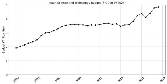 Trends in Japan’s science and technology budget. Japanese government’s initial budget for science and technology during FY2000–FY2024 in trillion yen (data from (National Institute of Science and Technology Policy [NISTEP], 2024)).