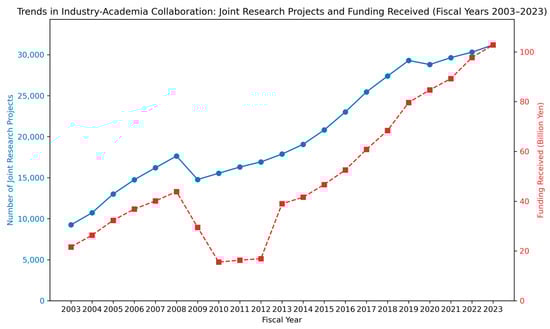 Trends in industry–academia collaboration: joint research projects and funding received (fiscal years 2003–2023). The number of joint research projects with industry (solid line) and the amount of funding received by academic institutions from companies (dashed line). Data from “Status of Industry–Academia Collaboration and Related Activities at Universities and Other Institutions” (https://www.mext.go.jp/a_menu/shinkou/sangaku/sangakub.htm, accessed on 29 April 2025).