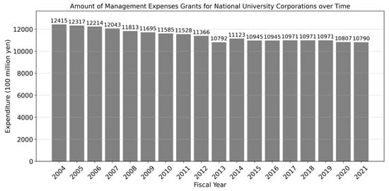 Changes in the amount of management expenses grants for national university corporations over time. Data from the reference materials for the MEXT study group on the future of operational subsidies for national university corporations during the fourth medium-term objective period (18 June 2021 meeting) (https://www.mext.go.jp/b_menu/shingi/chousa/koutou/108/toushin/mext_00003.html, accessed on 22 May 2025).