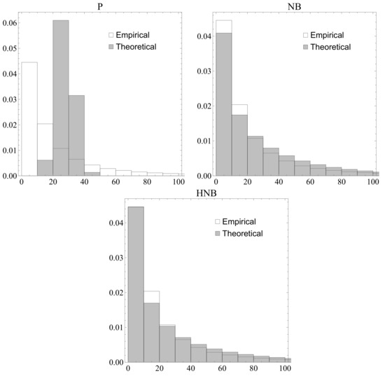 Figure 1 shows the empirical and fitted histograms of the number of citations obtained by the model based on the P, NB, and HNB distributions. From the graph shown in this figure, it is evident that the fit provided by the NB distribution is much better, especially for the tail of the data and for the zero value, which is particularly the case when the HNB distribution is considered.