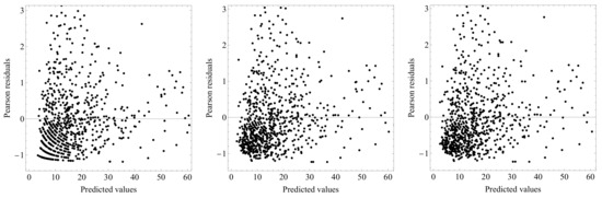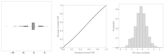 This model reduces to the Poisson distribution when and to the geometric model when . The log-likelihood function is shown in Appendix A. Details about the normal equations obtained from (A1) and second derivatives needed to obtain the variance–covariance matrix of the estimators can be found in Lawless (1987) and Cameron and Trivedi (1998).