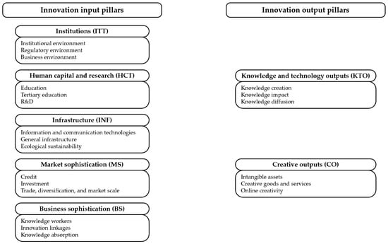 The overall GII index is composed of two equally important sub-indices: the innovation inputs sub-index and the innovation outputs sub-index. The innovation inputs sub-index is composed of five pillars (institutions, human capital and research, infrastructure, market sophistication, and business sophistication), and the innovation outputs sub-index is composed of two pillars (knowledge and technology outputs and creative outputs). Each of the seven pillars is divided into three sub-pillars, each of which is composed of individual indicators. Figure 1 illustrates the pillars and sub-pillars of the GII, organising its 80 individual indicators along this framework.