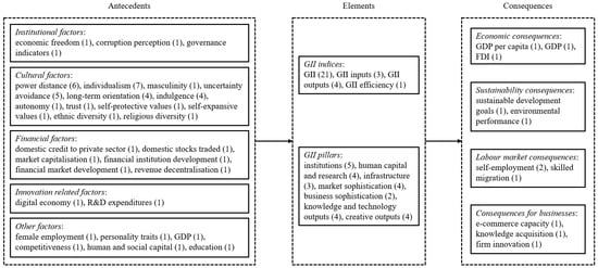 Our systematic review enabled us to address RQ 1 and RQ 2 by identifying the antecedents and consequences of the GII while also systematising the relationships among all dimensions of the GII. Antecedents were grouped into institutional, cultural, financial, innovative development, and other factors, while consequences were grouped into economic consequences, sustainability consequences, labour market consequences, and consequences for businesses. Figure 3 depicts the “antecedents–elements–consequences” framework of GII research (see Appendix C, Table A2, Table A3 and Table A4 for detailed descriptions).