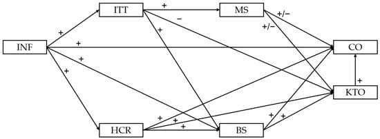 Relationships between GII dimensions. KTO: Knowledge and Technology Outputs. CO: Creative Outputs. ITT: Institutions. HCR: Human Capital and Research. INF: Infrastructure. MS: Market Sophistication. BS: Business Sophistication. Sources: Costa Cavalcante (2024), Duarte and Carvalho (2021), Fakhimi and Miremadi (2022), Sohn et al. (2016).