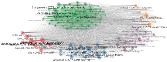 The “Competitiveness, entrepreneurship, and sustainable development” cluster (green) is the largest with 55 articles, followed by the “Innovation efficiency and innovation policy” cluster (blue—15 articles) and the “Innovation rankings” cluster (purple—14 articles). The “Culture” (yellow) and “Configurational methods” (red) clusters encompass 8 articles each. The average year of publication for the articles in each cluster is as follows: