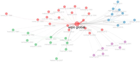 The co-citation analysis revealed four clusters (Figure 6) representing the knowledge bases used by the studies of our corpus. The identified communities were labelled “Economics literature” (red), the largest cluster with 19 articles; “Innovation systems” (green—10 articles); “Configurational methods” (blue—9 articles); and “Culture” (purple—6 articles). In the remainder of this section, we illustrate each cluster and its representative works (Table 2).