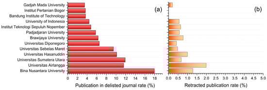 Comparison of publication rates in delisted journals (a) and retracted publication rates (b) among Indonesian universities flagged by RI2 (Meho, 2025b). The scales differ between the two axes: the delisted journal rate is shown on a 0–20% scale, while the retracted publication rate is plotted on a 0–5% scale.