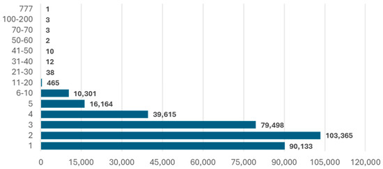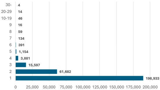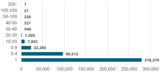A total of 432,592 authors were identified across the dataset, although they did not all appear with the same frequency. The number of authors per article varied considerably, with an average of 2.51 authors per article and a mode of 2. Figure 4 provides a general overview of the distribution of authorship per publication.