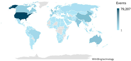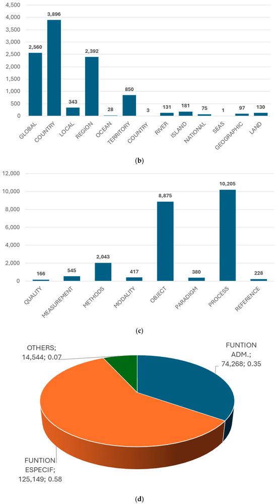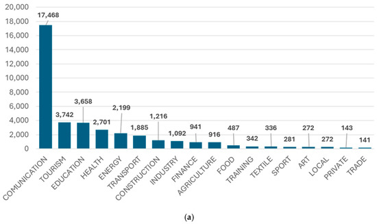 An analysis of keyword composition revealed that, on average, authors assigned five keywords to their articles, while journals indexed an average of four keywords per publication. The dataset included articles referencing 31 different socio-productive sectors, with communications being the most represented, followed by tourism, education, and healthcare (see Figure 9a–d). In terms of geographic scope, country-level analyses were the most common, followed by global and regional studies. Additionally, some publications focused on specific geographic features such as land areas, rivers, seas, oceans, or islands.