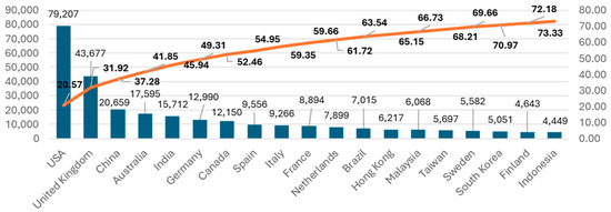 Although most countries contributed research articles, a closer look reveals that just 19 countries account for 73.33% of all publications (see Figure 8), confirming the applicability of the Pareto principle in this context.
