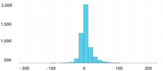 Figure 11 shows the error frequency distribution. As illustrated, the histogram represents the differences between the actual and predicted values produced by the regression model. The clustering of errors around zero suggests that most predictions were close to the exact values, which is a positive indicator of model accuracy. However, the dispersion at the extreme points to the presence of outliers or high-variability cases that may require further model refinement.