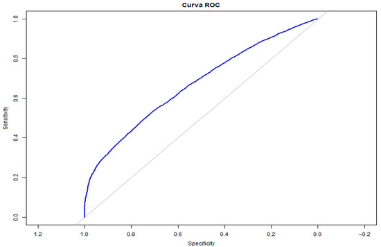 Likewise, the model’s predictive ability is illustrated in the receiver operating characteristic (ROC) curve shown in Figure 12. As observed, the blue curve representing model performance lies above the diagonal line, indicating that the model possesses some degree of discriminative capacity, albeit relatively modest.