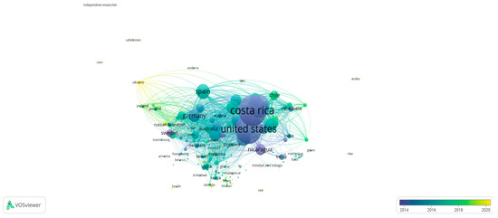 Second, the subsequent section highlights the countries exhibiting the highest degrees of international collaboration in the production of scientific articles (Table 5). The United States clearly dominates as the main partner of Central American researchers, accounting for 2288 co-authored publications. European countries such as Germany, the United Kingdom, Switzerland, Spain, France, and the Netherlands also play a prominent role, reflecting strong ties with the region’s scientific community. In addition, South Korea emerges as a significant Asian collaborator, while Brazil represents the most important partner within Latin America. Finally, Zambia appears as a noteworthy, though smaller, partner, illustrating the diversity of Central America’s international research linkages.