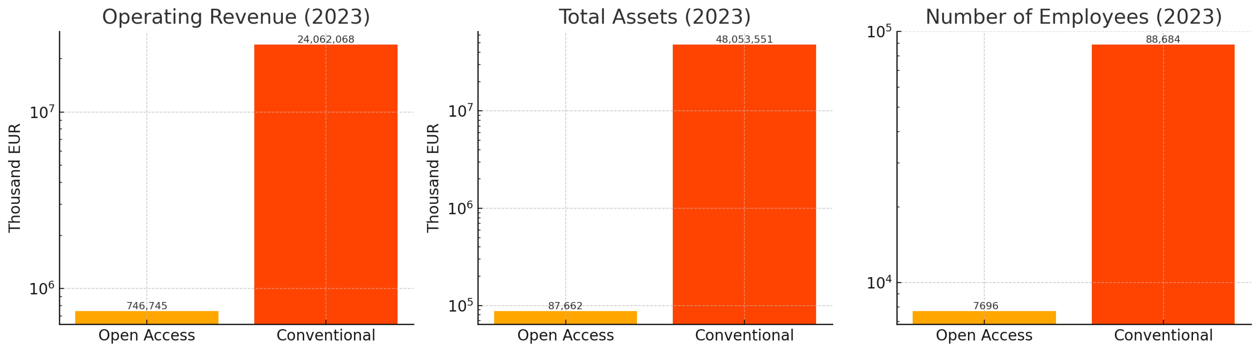 Figure 2 the scale of OA publishers versus legacy publishers in terms of revenue, assets, and employees. The differences in the scale of financial indicators are dramatic. Perhaps the most striking disparities between the groups are in absolute size. Legacy academic publishers are orders of magnitude larger than their OA-native counterparts in revenue, assets, and manpower. Over 2019–2023, the average annual revenue of a legacy publisher in our sample was about EUR 3.44 billion (median ~EUR 2.0 billion), whereas for an OA publisher it was only about EUR 149 million (median ~EUR 50 million). In 2023, RELX, Elsevier’s parent company, alone earned over EUR 10.5 billion, while the largest fully OA publisher, Frontiers, had revenue on the order of EUR 58 million. Total assets show an even greater gulf: legacy publishers held ~EUR 6.9 billion in assets on average (with extensive journal portfolios, acquired imprints, and data platforms contributing to asset value), compared to roughly EUR 10 million in assets for the typical OA publisher. Employee counts likewise highlight scale differences: the leading legacy firms employ tens of thousands (median ~7800 staff), whereas OA publishers often have only a few hundred employees (e.g., Frontiers ~1000; MDPI ~6600