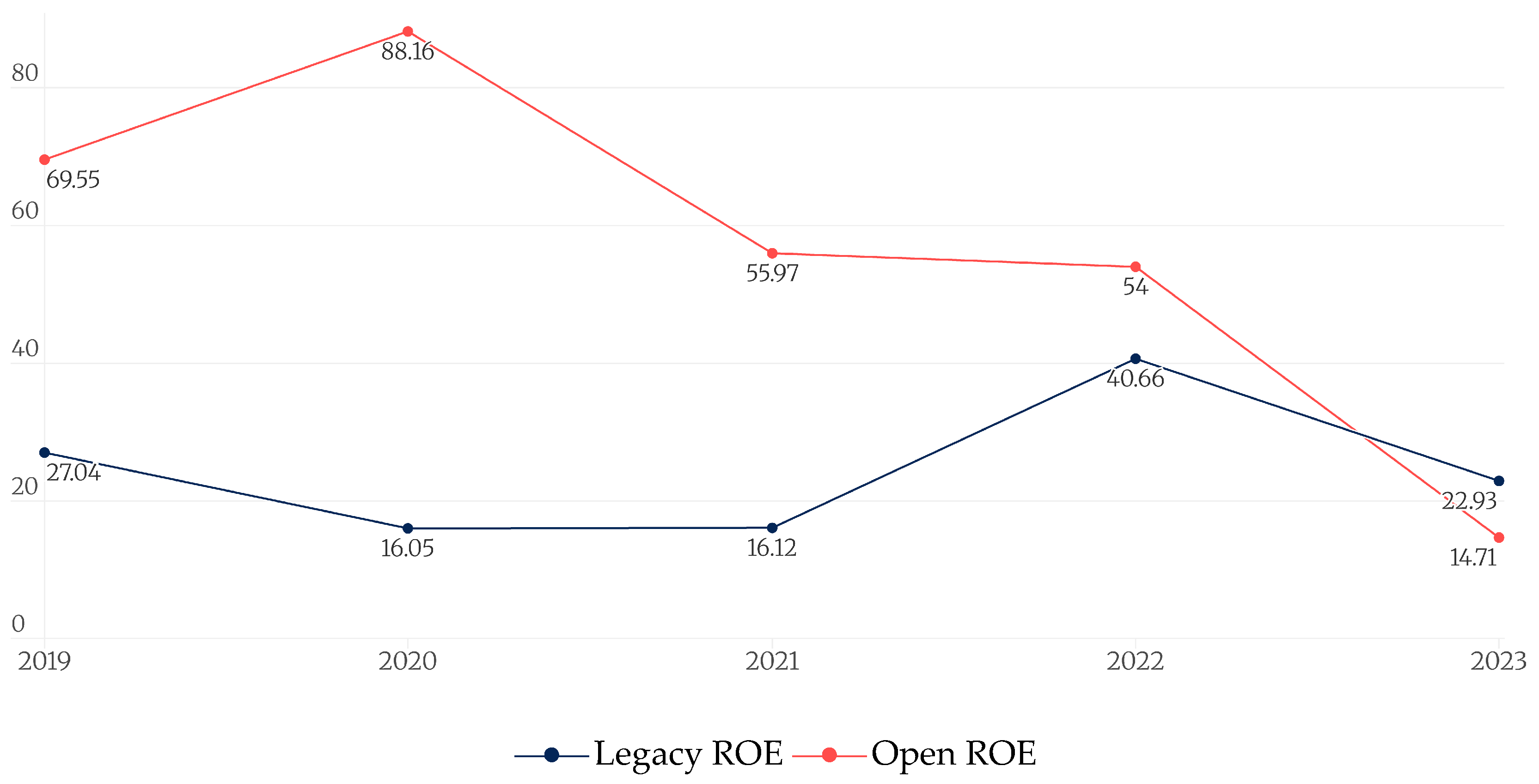 In comparing ROE between the Legacy and Open Access groups, the Mann–Whitney U test yielded U = 183.00, p = 0.093 (exact p = 0.097), indicating no statistically significant difference at the 5% level. Although the result approaches the 10% threshold, it provides only marginal evidence of a difference in ROE distributions between the two groups.