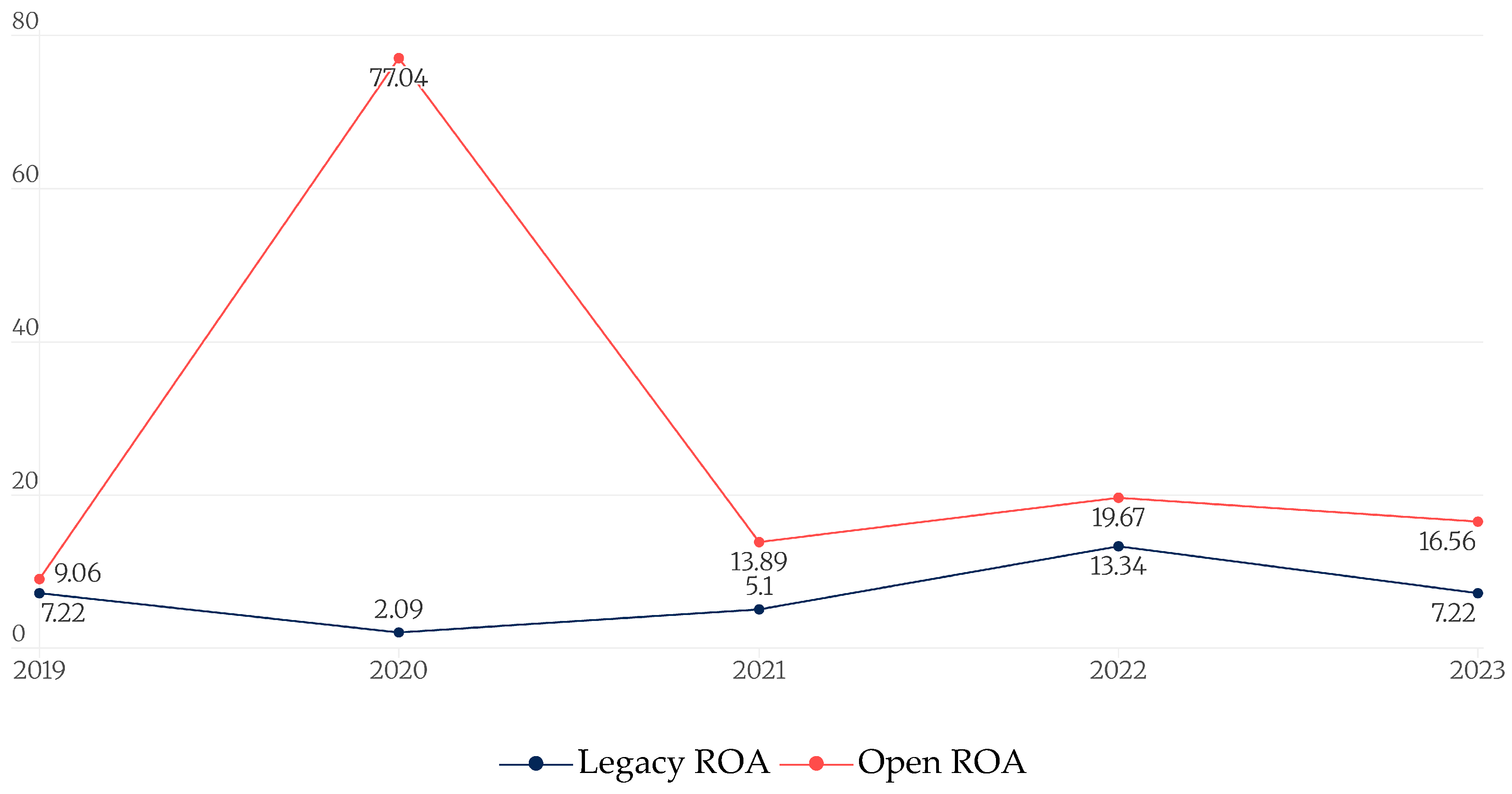 Median ROA values were more consistent. The corresponding medians are 9.06%, 77.04%, 13.89%, 19.67%, and 19.31%. The five-year averages are 28.41% (mean) and 27.79% (median). Relative to legacy publishers, OA outperforms on average (≈28% versus ≈8% mean ROA), but with pronounced volatility, most notably the 2020 spike, while 2023 shows some convergence in levels.