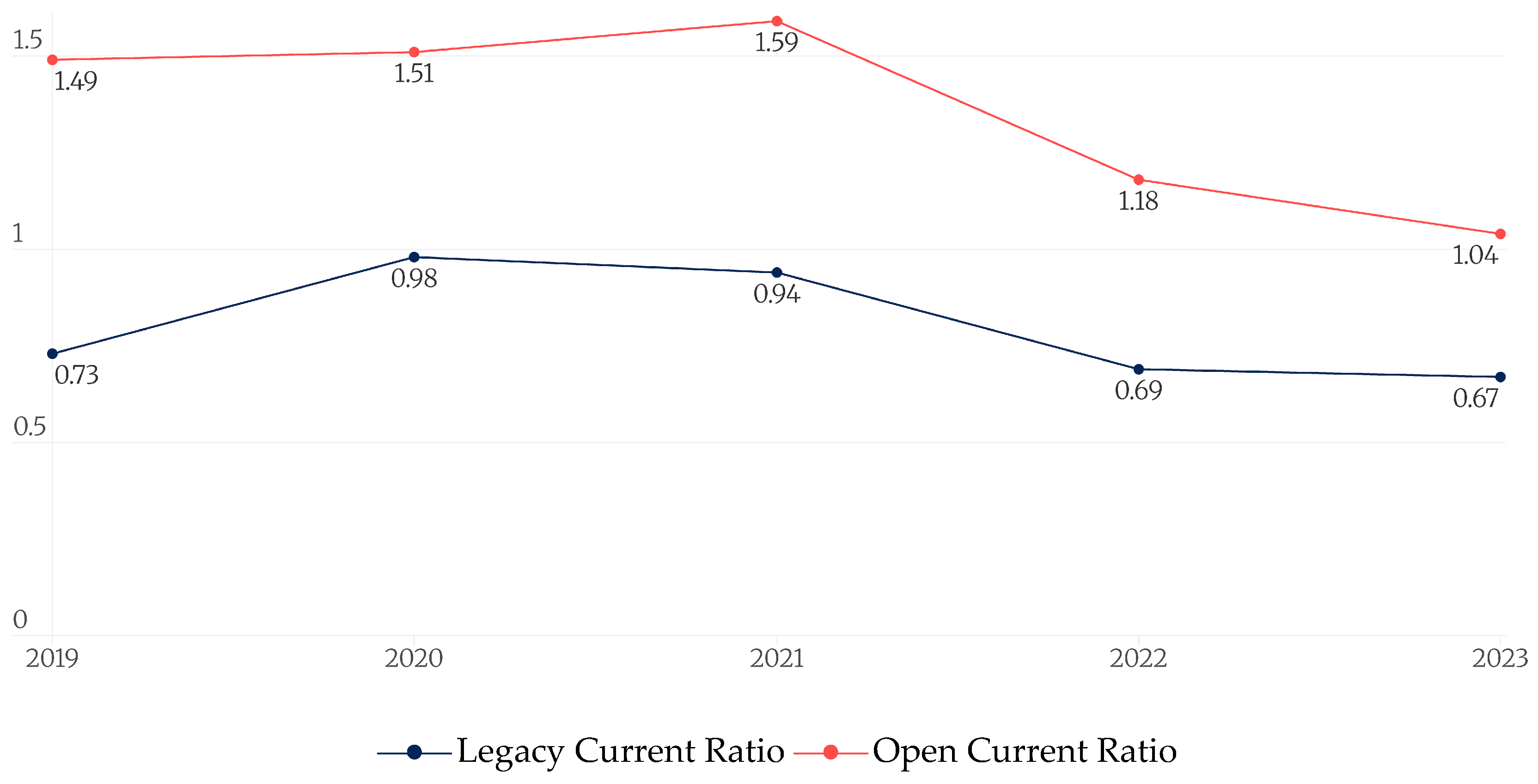 Figure 5, legacy publishers consistently reported current ratios below 1.0 over the five-year period, indicating a structurally negative working capital position. Specifically, their mean current ratio ranged from 0.74 in 2019 to 0.96 in 2022 before declining to 0.79 in 2023. The median values remained slightly lower, between 0.67 and 0.98, reflecting a stable trend of current liabilities exceeding current assets. This is typical in the industry due to substantial deferred subscription revenue, which is recorded as a current liability but does not require short-term cash outflows. In contrast, OA publishers maintained significantly higher current ratios, suggesting stronger liquidity positions. The group’s mean current ratio increased from 1.06 in 2019 to 2.71 in 2021, the latter driven by an outlier (MDPI) that held an unusually large cash balance relative to its current liabilities. By 2022, the mean had normalized to 1.52 and 1.90 for 2023.