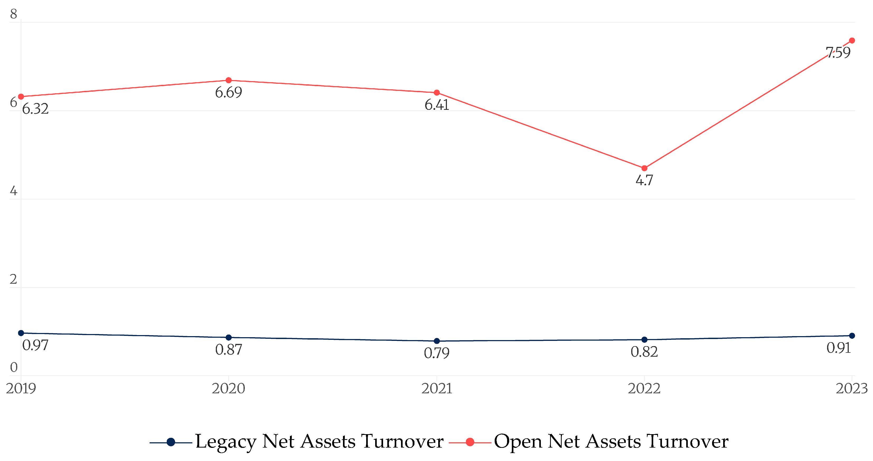 OA publishers are not more operationally efficient than legacy publishers: We hypothesize that OA publishers will exhibit significantly higher net assets turnover ratios, reflecting a more efficient conversion of equity into revenue. We think that OA, with a smaller size and its non-traditional approach, will be able to perform better than legacy publishers.