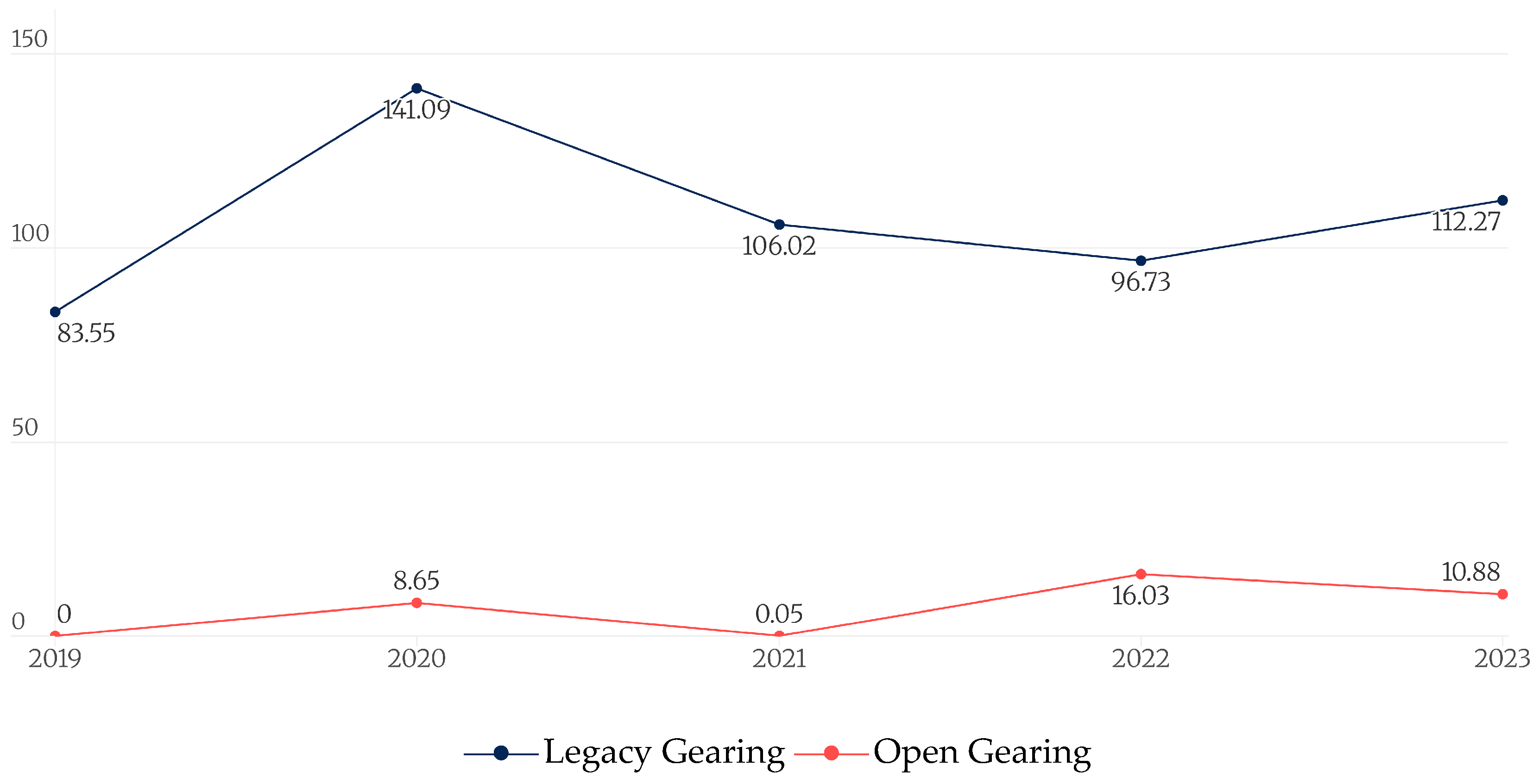 In contrast, OA publishers exhibit minimal reliance on debt financing. While the mean gearing ratio for OA publishers in 2019 is 35.41%, this is entirely attributable to Frontiers, which reported this ratio individually. The median value for OA in 2019 was 0%, as most OA publishers had no recorded debt. In 2020, the OA mean fell to 13.30%, reflecting modest debt levels across two firms (PLOS and Frontiers). By 2021, the mean rose again to 31.35%, but this again reflects the inclusion of Frontiers as the only firm with substantial debt; the median was 0%. In 2022, with four data points, the mean dropped to 27.78%, and the median was 16.03%, further reinforcing the conclusion that most OA publishers remain virtually debt-free, while Frontiers is the outlier. The overall five-year mean gearing for OA publishers was 26.07%, and the median was significantly lower.