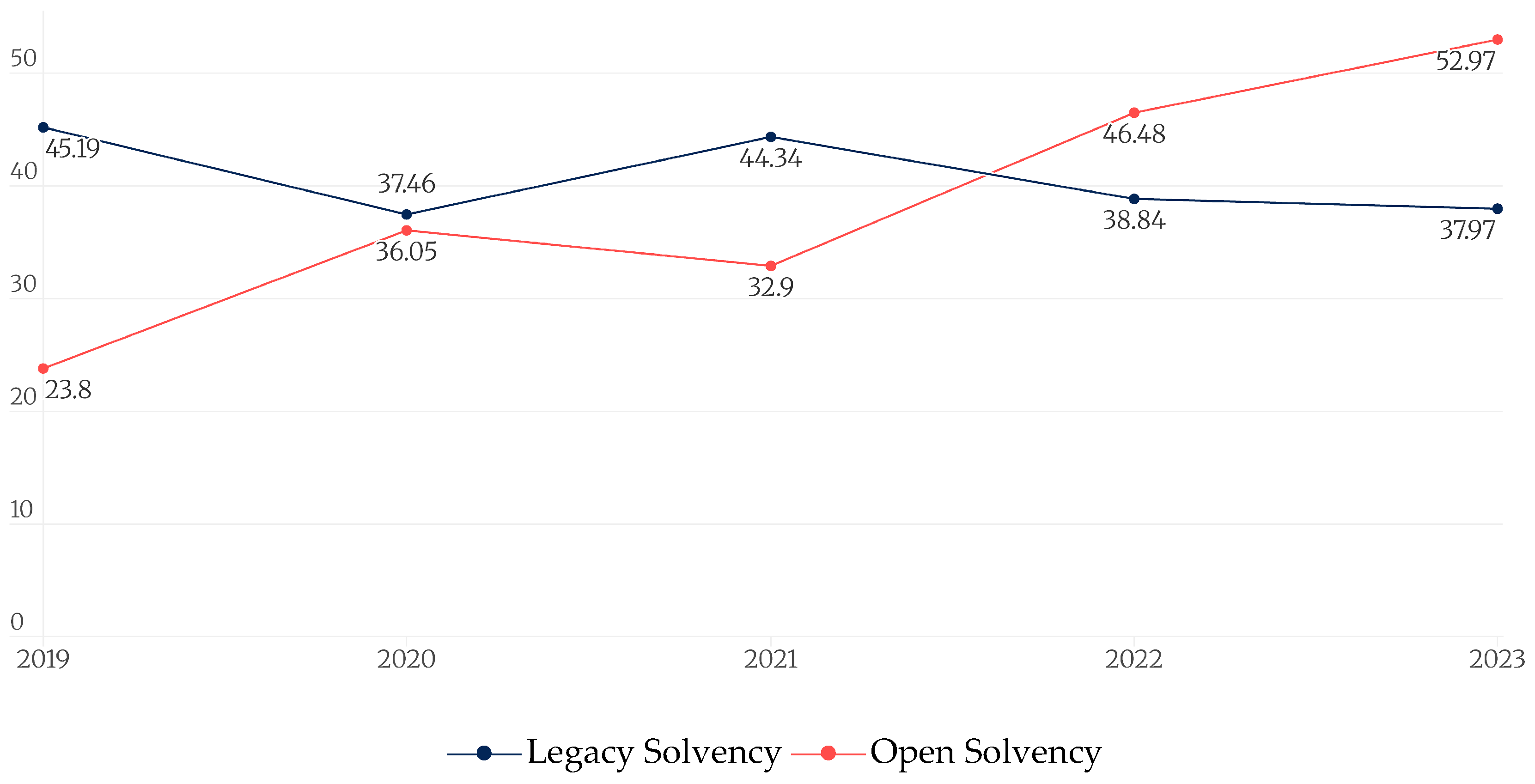 In the following sections, we present detailed financial ratio comparisons, grouped by category. For each category, we provide data on the mean and median values for the OA versus the legacy group for each year from 2019 to 2023, as well as the five-year average. We also describe notable trends visible in the data.
