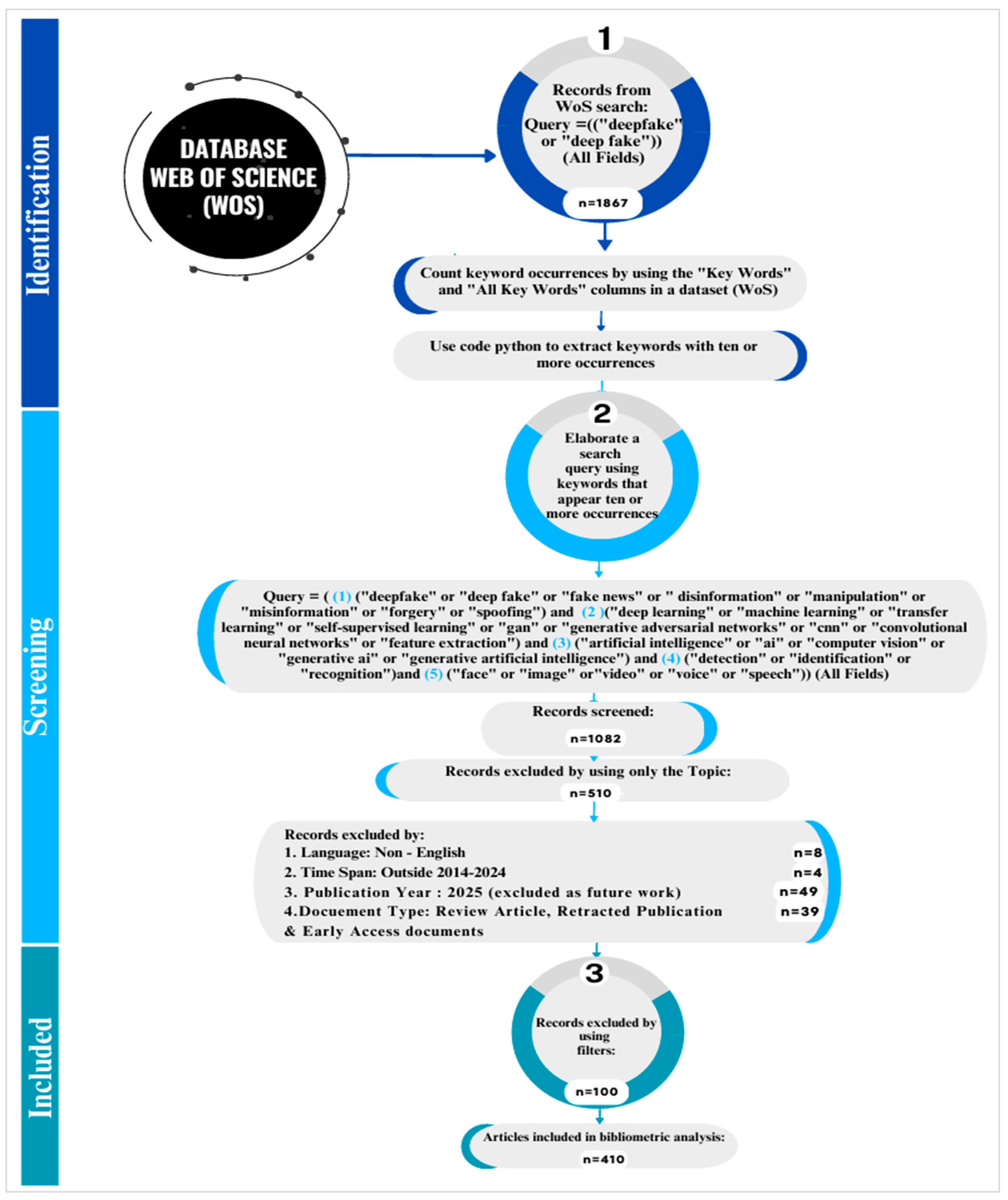 TS = ( (1) (“deepfake” or “deep fake” or “fake news” or “ disinformation” or “manipulation” or “misinformation” or “forgery” or “spoofing”) and (2) (“deep learning” or “machine learning” or “transfer learning” or “self-supervised learning” or “gan” or “generative adversarial networks” or “cnn” or “convolutional neural networks” or “feature extraction”) and (3) (“artificial intelligence” or “ai” or “computer vision” or “generative ai” or “generative artificial intelligence”) and (4) (“detection” or “identification” or “recognition”) and (5) (“face” or “image” or “video” or “voice” or “speech”)).