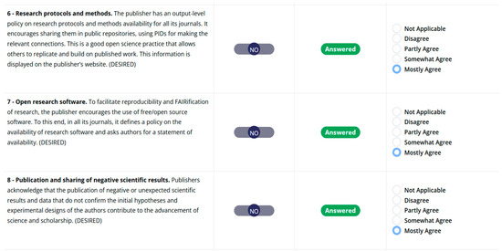A last column appears whenever a “no” has been given as a reply, proposing a set of options to help explain the reasons for that negative response and the degree of agreement with the statement proposed by the specific item: Not applicable, Disagree, Partly Agree, Somewhat Agree, and Mostly Agree (Figure 2).