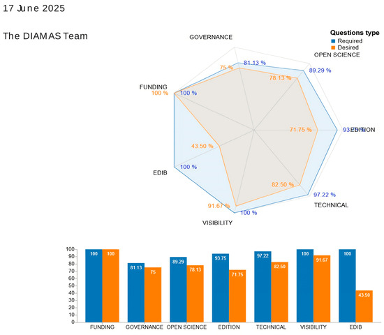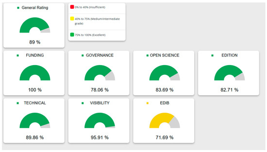 While full compliance was reached in the first category, as shown in Figure 4, in the other six categories the compliance ranged from 95.91 (Visibility) to 71.69 (EDIB) showing a general adherence to the Diamond OA Standard. The area with a least compliance is EDIB, though it is also true that it concerns relatively new matters that need to be carefully examined and on which continuous updating is necessary.