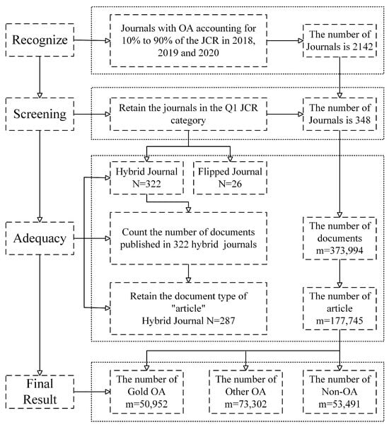 The criteria for journal screening in this study are derived from the Journal Citation Reports (JCRs). Papers in the field of Biology & Biochemistry are selected as the research object. Journals in this discipline with 10–90% of OA papers in the years 2018, 2019, and 2020 in the JCR database are retrieved, and a total of 8147 journals are obtained. Based on the Journal Impact Factor (JIF) Quartile of the journals in JCR, the journals are classified into four grades: Q1, Q2, Q3 and Q4. To ensure the quality of the journals, 348 hybrid journals with a journal grade of Q1 are selected. After a meticulous one-by-one examination of these journals, it was discovered that a total of 26 of the journals had transitioned to OA journals within these three years. Finally, 287 journals are screened out. The number of articles published in 287 biochemical journals is shown in Appendix A. In this paper, only papers with the document type “Article” are chosen, and a total of 177,745 papers are acquired. Among them, 50,952 are gold OA papers, 73,302 are other OA papers, and 53,491 are non-OA papers. Flowchart of data screening is shown in Figure 1.