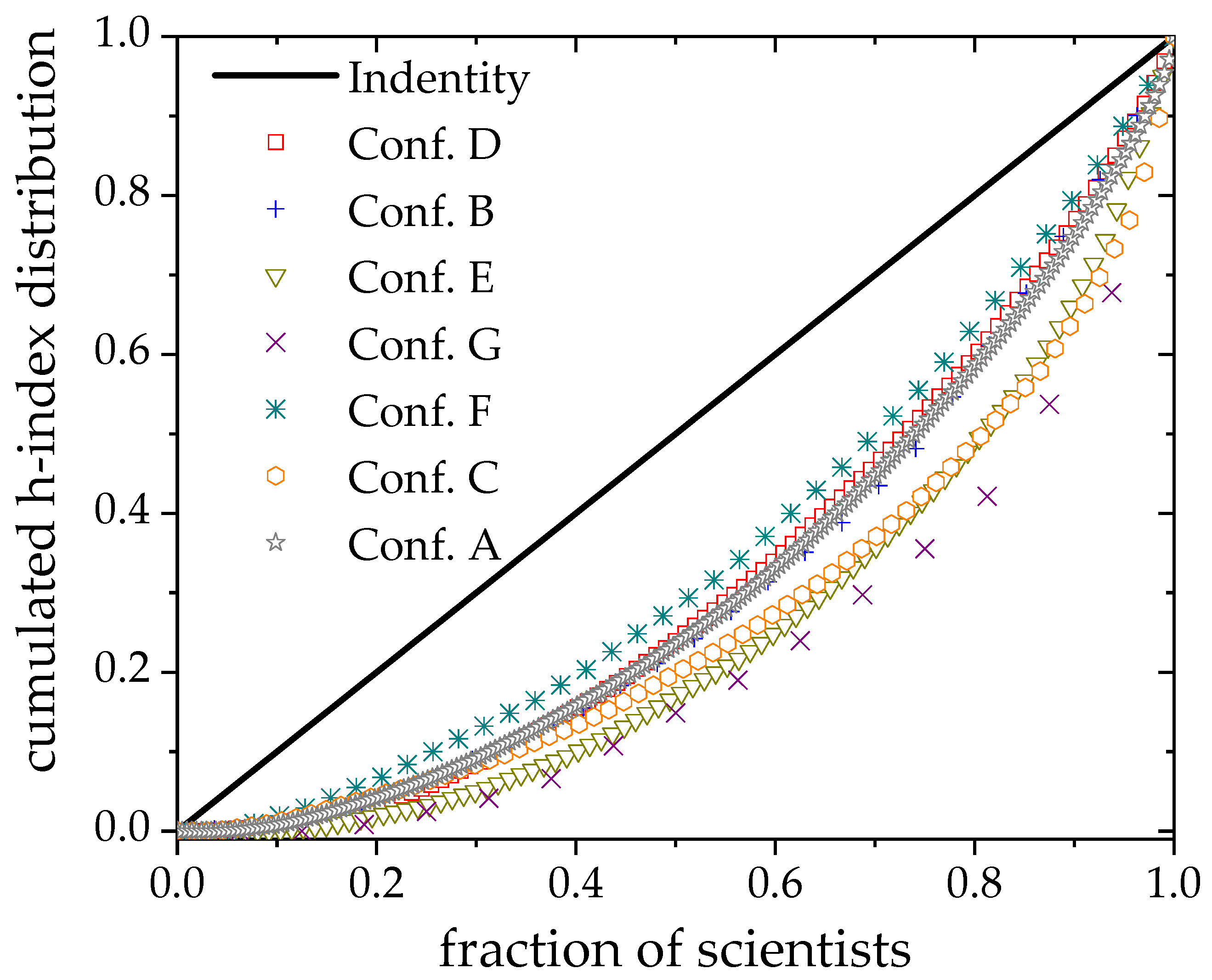 Our results show a divergent ranking from the one that would be established by the simple calculation of the average of the h-indexes. Our α-index shows the need for the inclusion of the Gini coefficient or another homogeneity parameter in the analysis of the quality of conferences. Many conferences have a high due to just a small fraction of the TPC. The Gini coefficient shows how representative the computed is. A low g denotes that the conference has a robust . Furthermore, it means that any smaller sample collected from the group should have the same , making it independent from the sample. Conferences with a high Gini coefficient have discrepant TPC members, which is a sign of questionable quality.