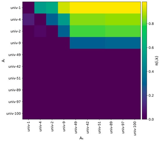 The raw data of scientometric indicators were first normalized into a dimensionless range of (0, 1) using the normalization procedures Equations (6) and (7). This transformation eliminated unit inconsistencies between indicators and allowed direct comparison across all criteria. All indicators were of the benefit type, meaning higher values indicate better performance. Consequently, all normalized values became positively oriented toward the ideal condition. Table 7 presents the normalized decision matrix derived from this process. It shows that several universities achieved normalized values close to 1 across most benefit criteria, signifying strong overall scientometric performance.