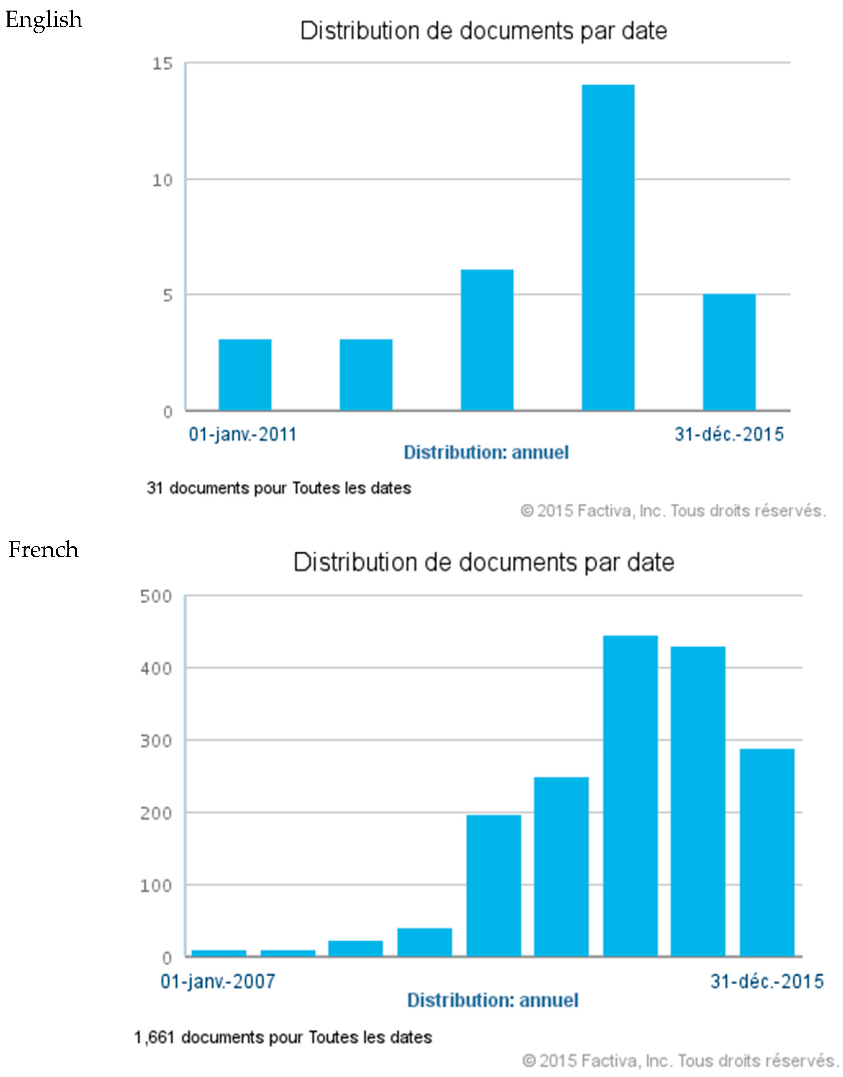 In her report, the student describes the context of the term’s emergence in relation with the 2008 global economic crisis and offers several examples of uses of this term in various contexts, in the general and specialized press and by the financial institutions. To better understand the conditions of emergence of this neologism, and for the purpose of this paper, the press database Factiva was used to offer a more systematic statistical and diachronic comparative approach. Factiva database provides economic and financial information from 36,000 sources, 200 countries and 28 languages. The figures given below show diachronic charts extracted from it. Selecting English-language sources combined with the term “shadow banking” with no date limit produces a selection of 27,624 documents. In contrast, selecting French sources featuring the term “shadow banking” (in English) with no date limit produces a selection of 1661 documents.
