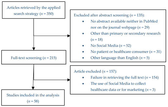 Three hundred fifty studies involving social media, medical information, and patient/healthcare consumer-related subjects were identified by applying the aforementioned search strategy. Two hundred fifteen studies passed the title and abstract screening (Figure 2).
