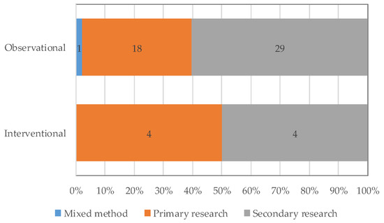 Majority of the included manuscripts had a secondary research design (59%) and 86% of the eligible studies were observational. There is a statistical difference between the percentage of interventional and observational studies (Z = 13.208, p < 0.0001). Most observational studies had a secondary design through web crawling (60.42%, 95% CI [45.877–74.957]). The distribution of design by study is presented in Figure 3.