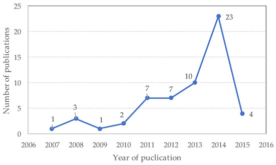 The investigated statistical unit was questionnaires, posts, pages, and conditions, categories and posts with sample sizes ranging from 11 to 36,042, and as expected with the highest sample on secondary research designs. The manuscript included in the analysis were published in 2007, with the highest number published in 2014 (39.66%, 95% CI [27.616–53.419]) (Figure 4).