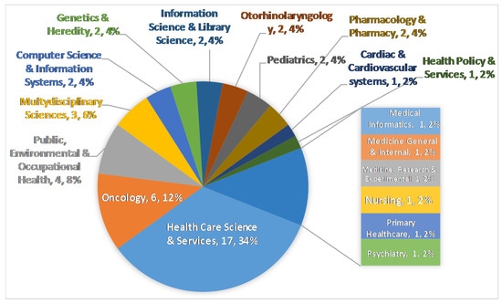 Fifty out of 58 studies included in the analysis (86.21% (95% CI [74.168–94.798]) were published in journals indexed also in Web of Science (WOS), most of them classified in Health Care Science & Services as first domain, follow by Oncology and Public, Environmental & Occupational Health (Figure 5). Half of the WOS articles were published in journal classified in the first 25% journals in their domains. Most of the studies included in the analysis were published in the Journal of Medical Internet Research (25.86%, 95% CI [15.547–39.625]).